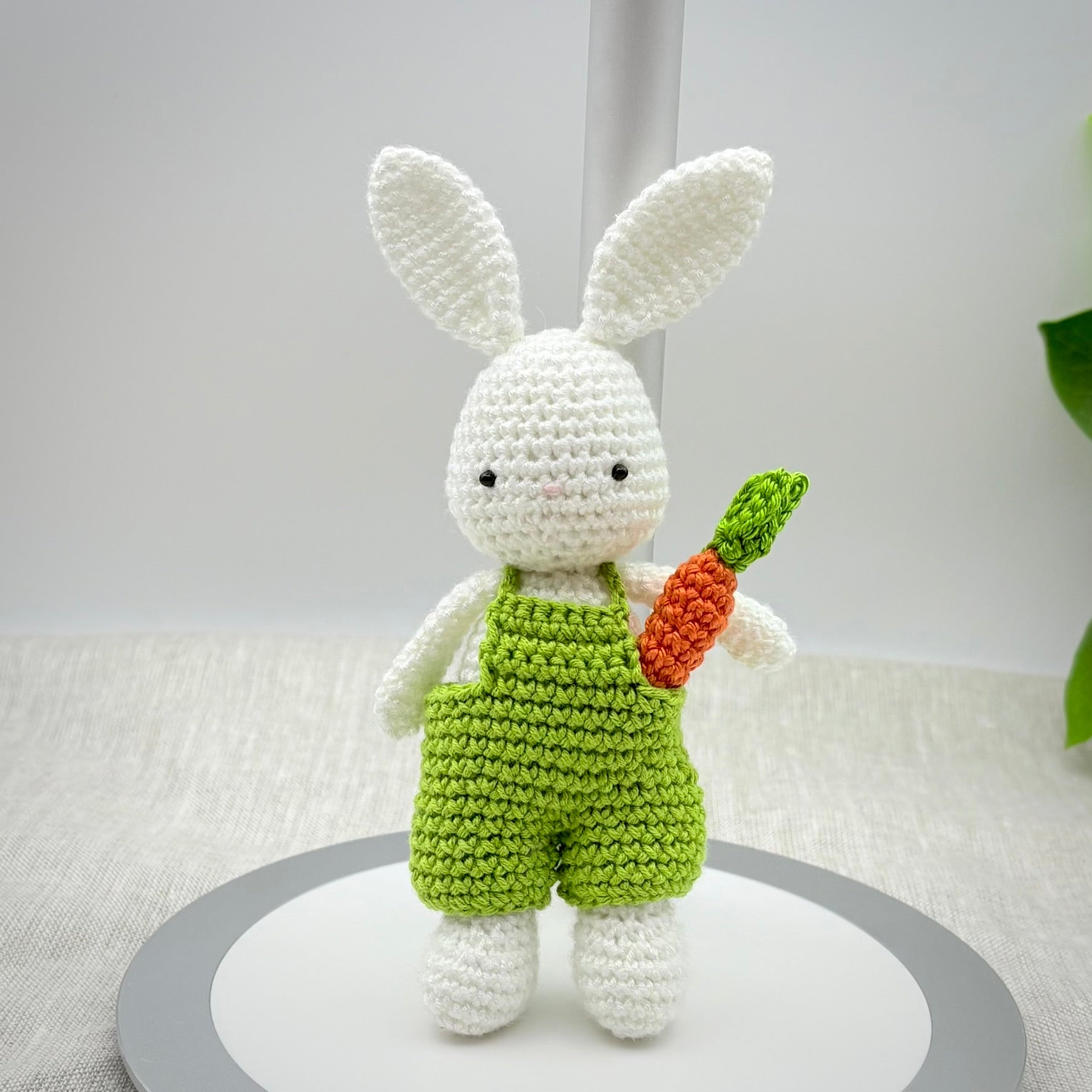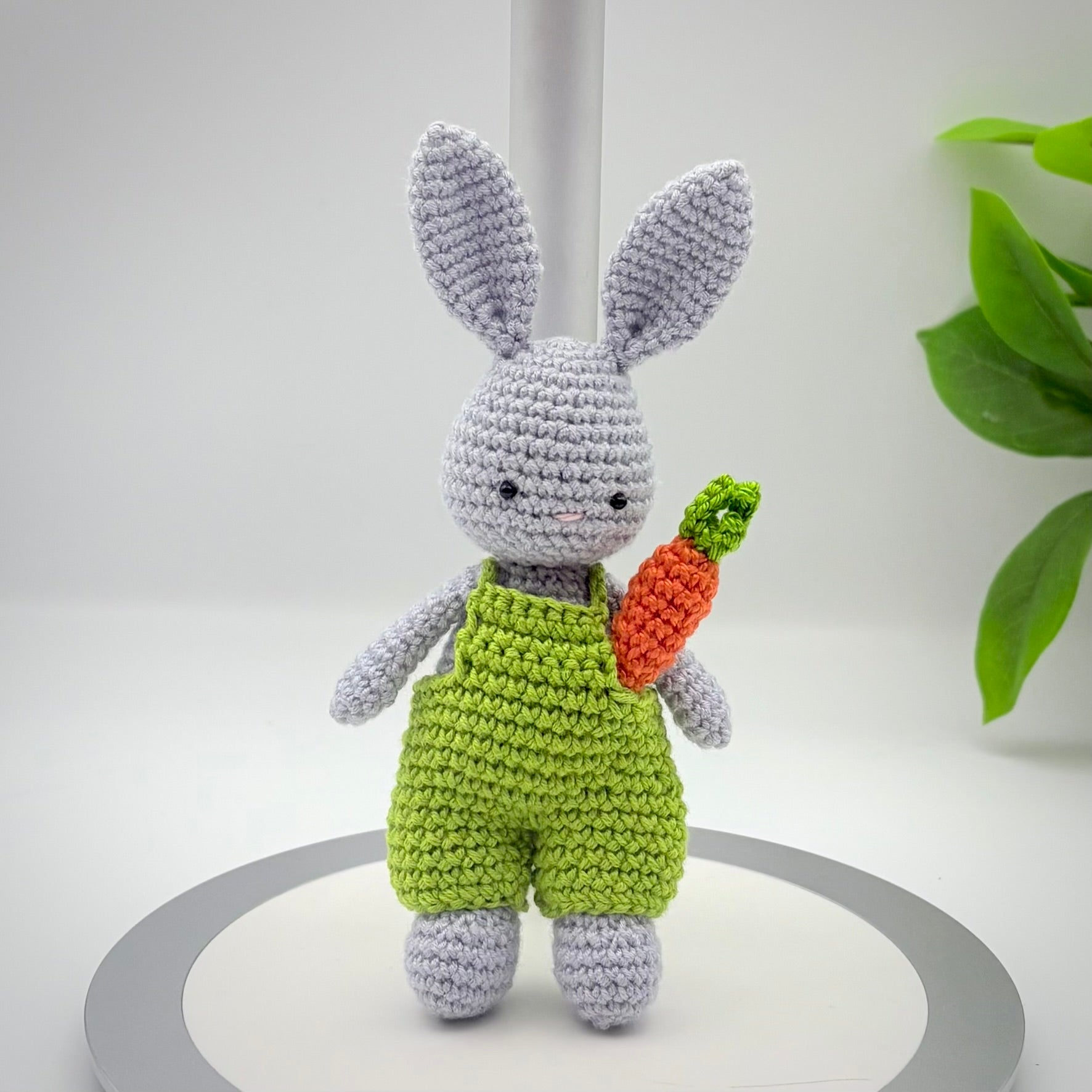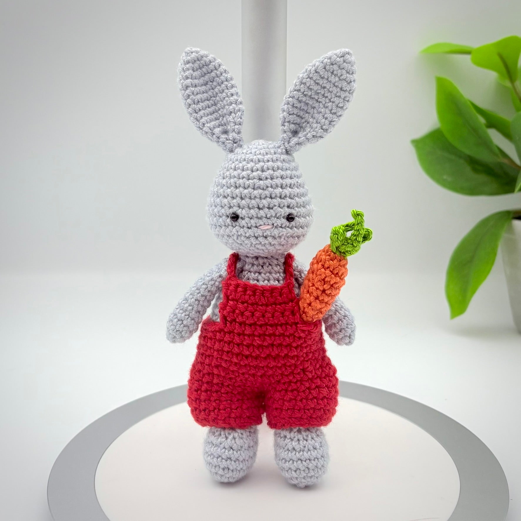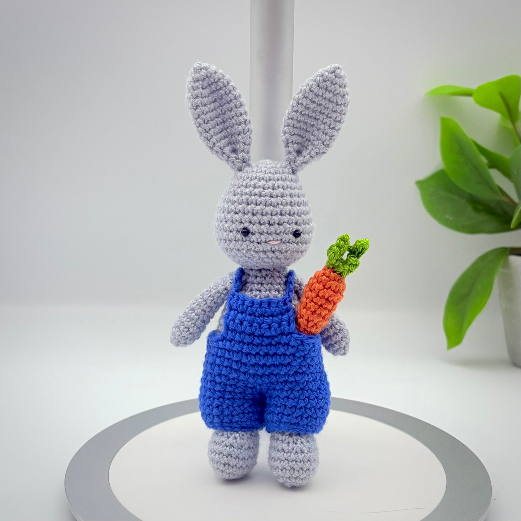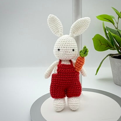 Meet Your New Best Friend! This adorable handmade crochet bunny is ready for adventure! Dressed in colorful overalls and carrying his favorite carrot, this little rabbit is the perfect size for small hands to hold or to sit perfectly on a nursery shelf.
