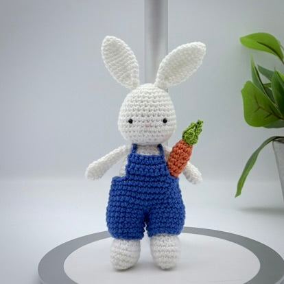 Crochet Bunny Plushie - Small Rabbit in Overalls with Carrot - Amigurumi Bunny Toy