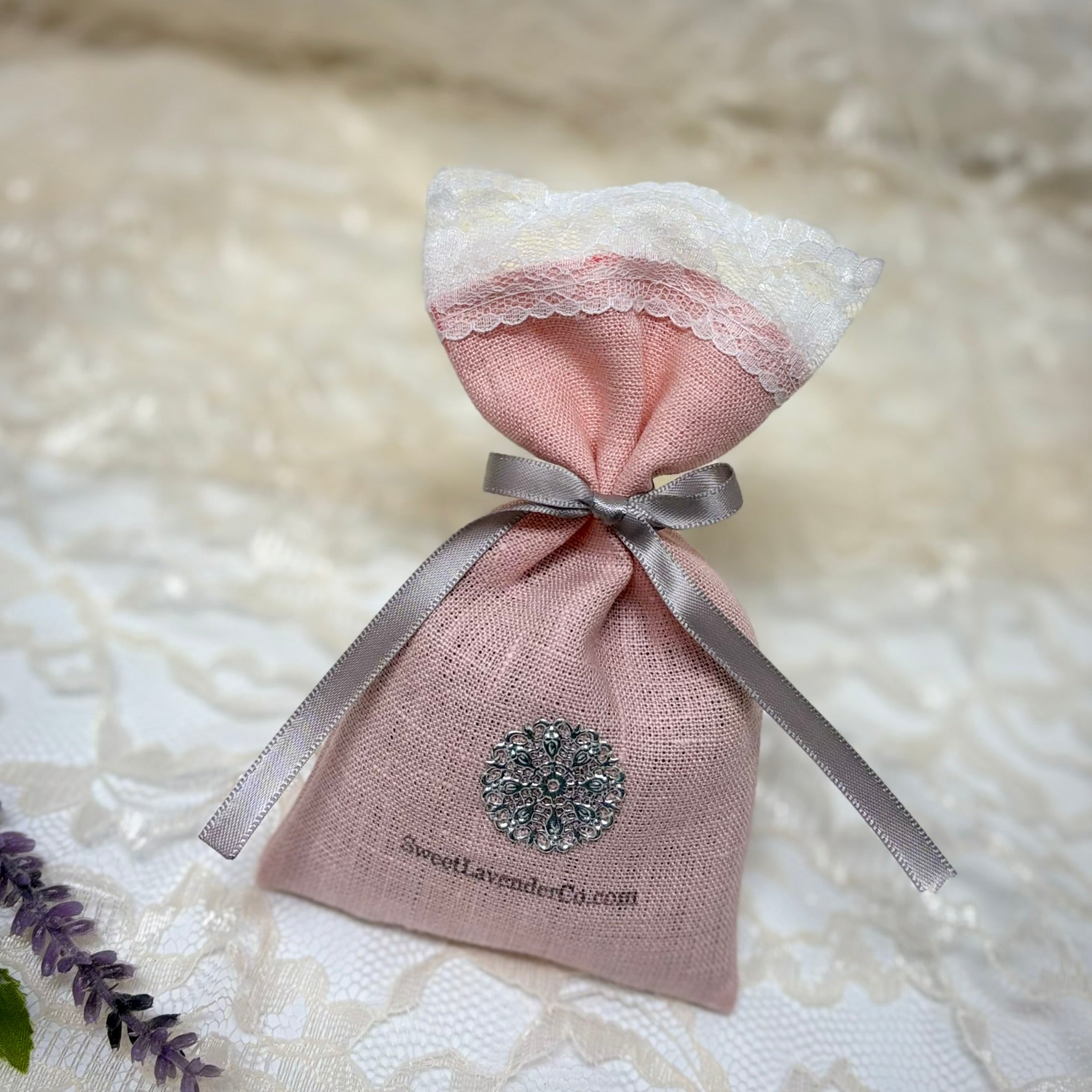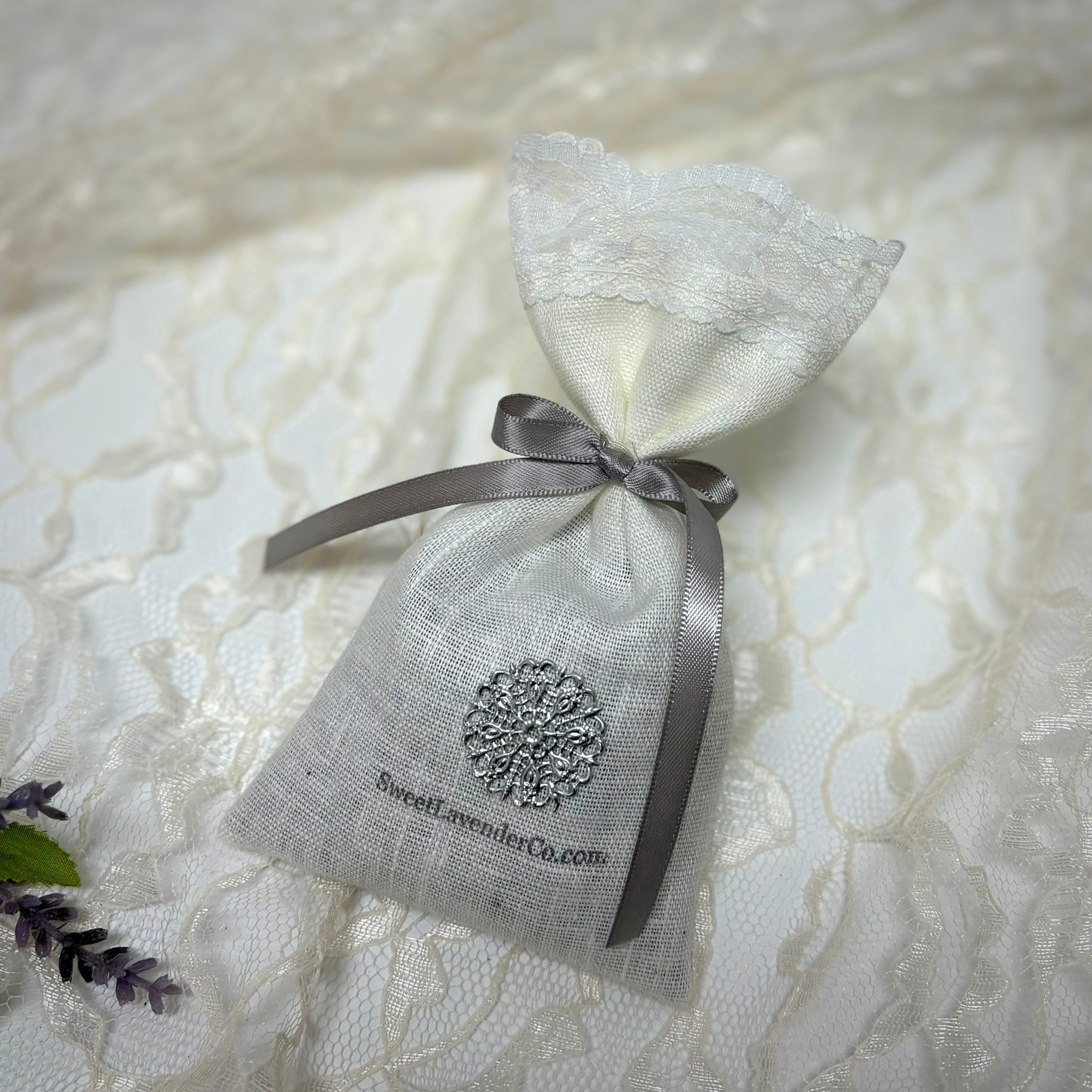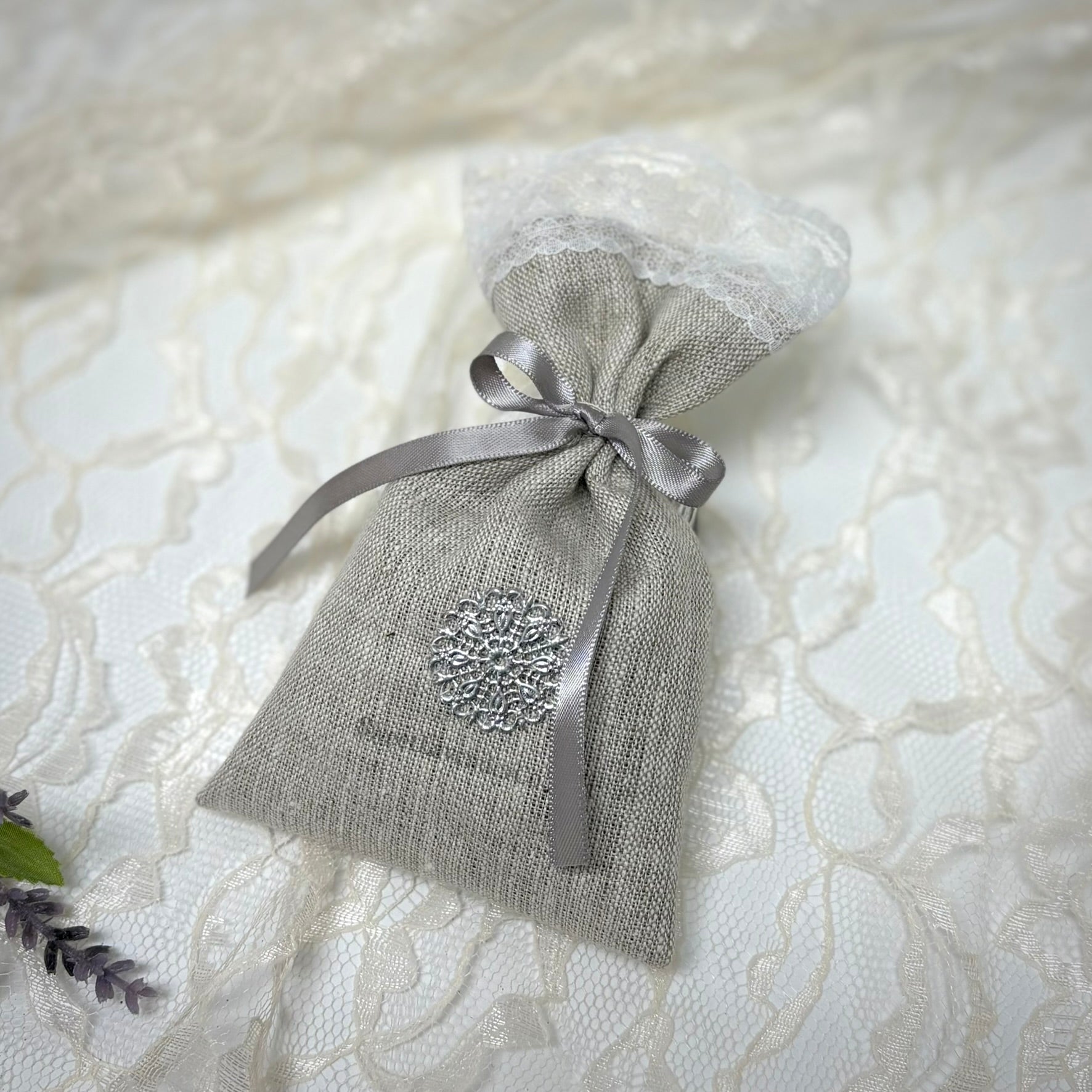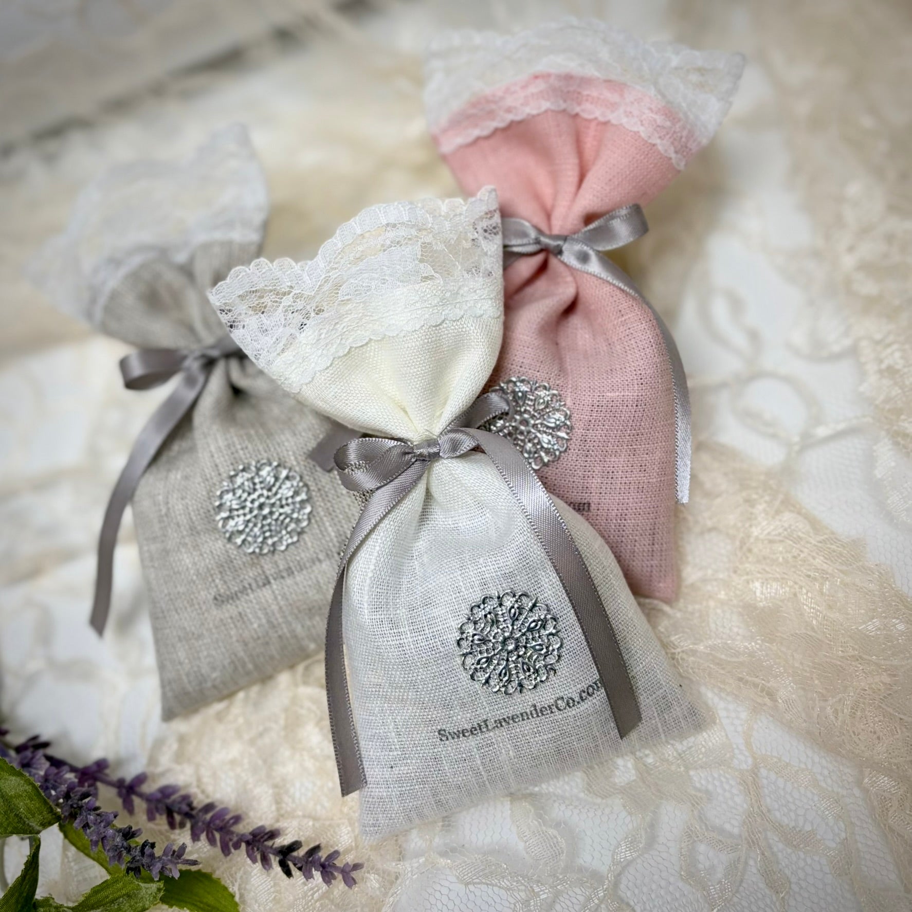 Handcrafted lavender pouches featuring elegant linen, lace, and ribbon.