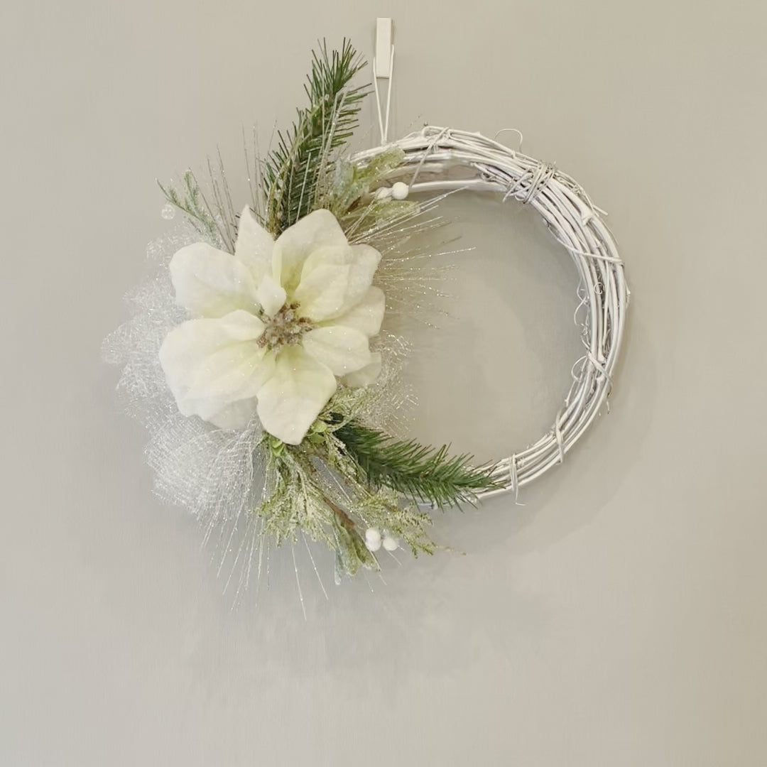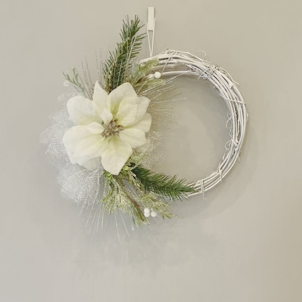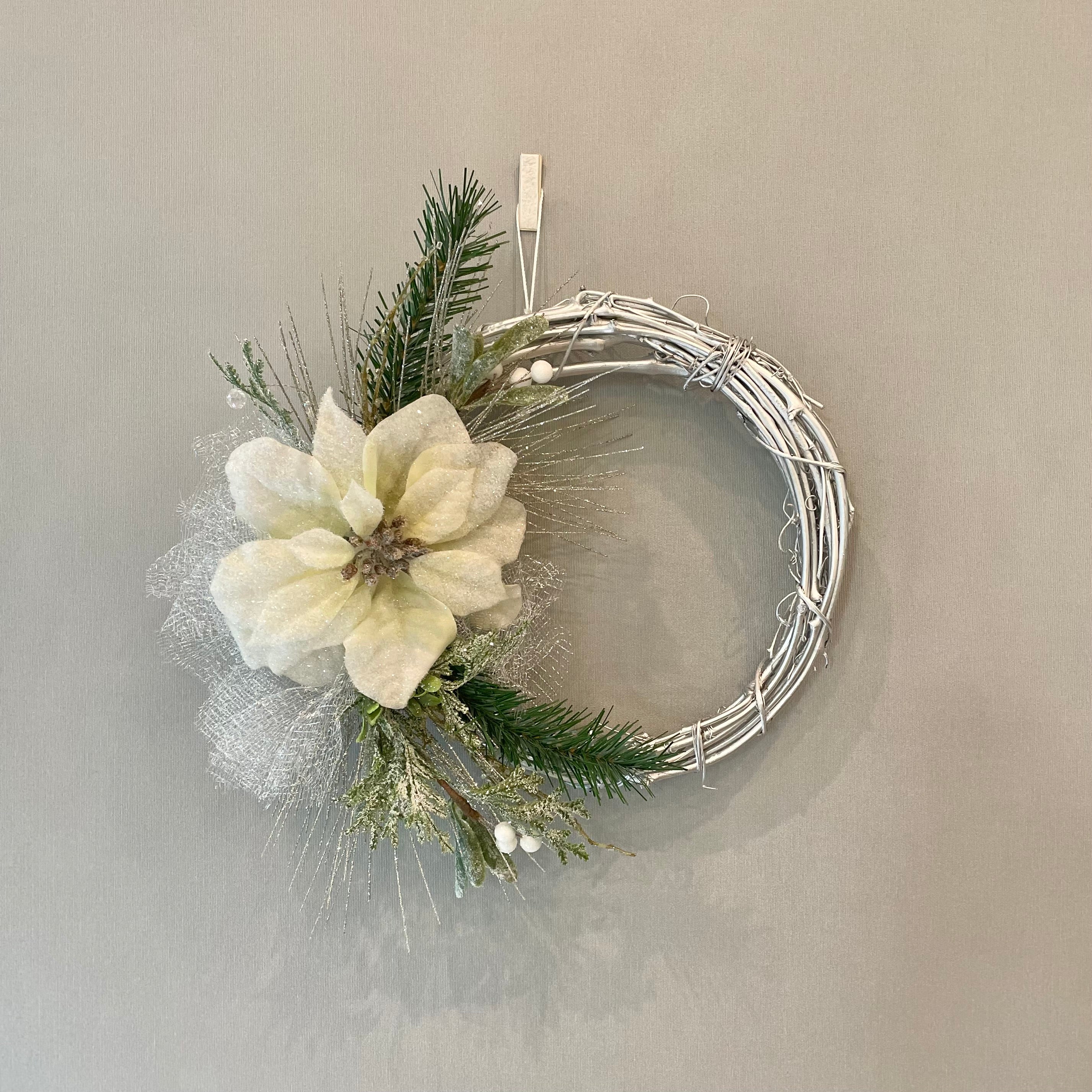 Handmade wreath featuring white poinsettias on its silver vine ring.